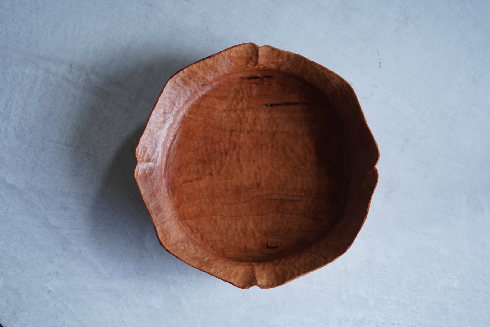 花を形取った大きなフラワーリム。 山盛りのパスタを何人かで取り分けて使うシーンや、前菜のサラダなんかにも似合いそうです。 細やかな曲線から成る造形が美しく、食卓を鮮やかにしてくそうな作品です。 山口市で制作されている漆器・木工作家の角さん。 手彫りの漆器や木工作品を作る傍らで、音楽活動もされていて作業所にはスケートボードも置いてある。「なんかこのバランスが良いみたいなんです」と、話してくれた事をよく覚えていて、自分の「手」から生み出されるものに対して、素材自身がなりたい形を読み取って自分の形へと変換して制作しているように思えた。 手彫りで仕上げていく中で、木目や年輪または量感を無意識に読み取っているのか、輪郭に柔らかいものを纏った揺れがある。しっかりとした重さとその柔らかさからか、作品からは温もりを感じる事ができる。テーブルにこの木器が並んだ姿を想うと、きっと朗らかな食卓の時間になるだろうと想像できる。 作家:角俊弥 / Toshiya Kaku Material:チェリー / Cherry wood Finish:蜜蝋 / Beeswax Size:W26.5cm D26.5cm H5.5cm ・ひとつひとつ手で製作されています。寸法、形状、容量、重さなどに多少の誤差がございます。 ・電子レンジ ×・食洗機 × ・お客様のご都合による返品(イメージと違った、気が変わった等)はお受けしておりません。 ・実店舗と在庫を共有しているため、ご注文時に実店舗で在庫切れになっている場合がございます。その際はキャンセルとなりますことをご了承ください。