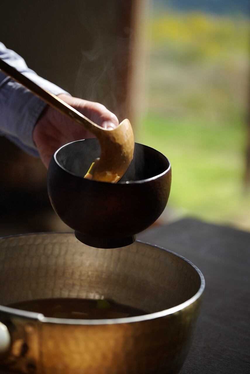 素材は北海道の朴の木で、手彫りの彫り跡と漆が手によく馴染み、丸い形も柔らかく、温かい料理を受け止めてくれます。