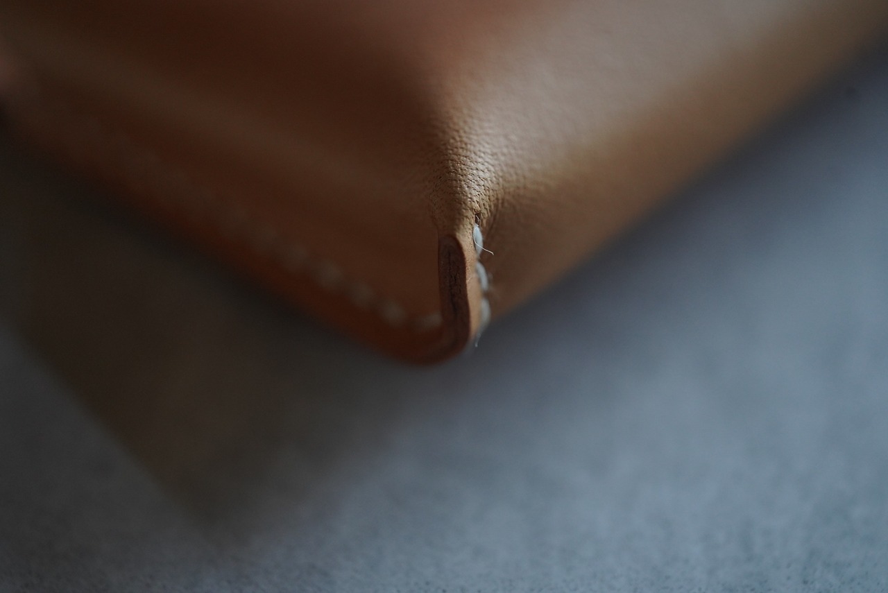 手縫いによって非常に高い精度で縫製されており、細部まで美しく仕上げられています。底の部分に特徴的なマチがデザインされており、一枚革での縫製を可能にしてあります。