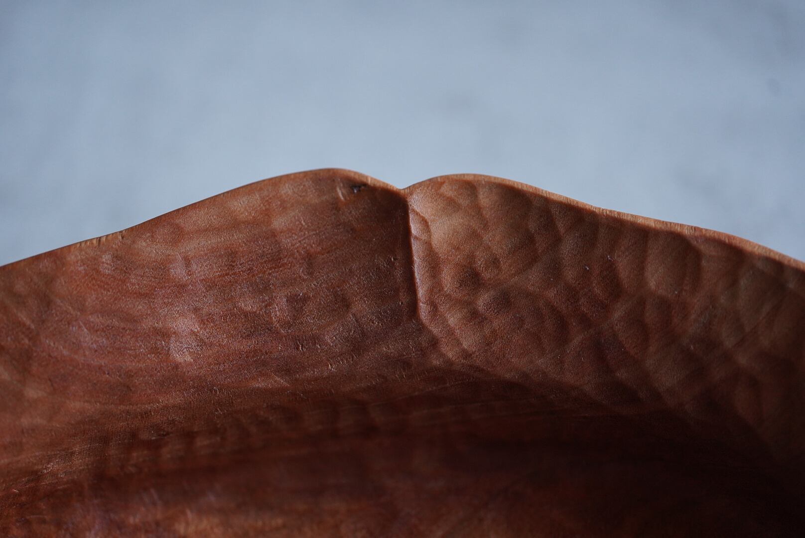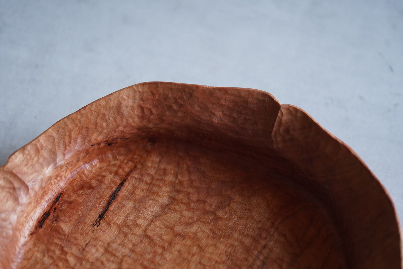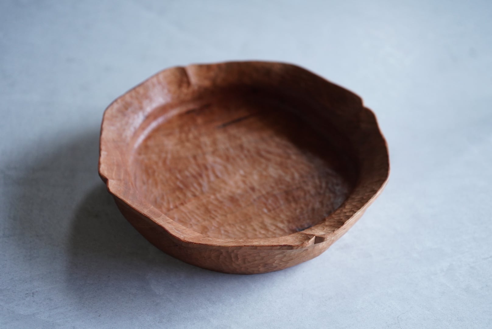 手彫りで仕上げていく中で、木目や年輪または量感を無意識に読み取っているのか、輪郭に柔らかいものを纏った揺れがある。しっかりとした重さとその柔らかさからか、作品からは温もりを感じる事ができる。テーブルにこの木器が並んだ姿を想うと、きっと朗らかな食卓の時間になるだろうと想像できる。