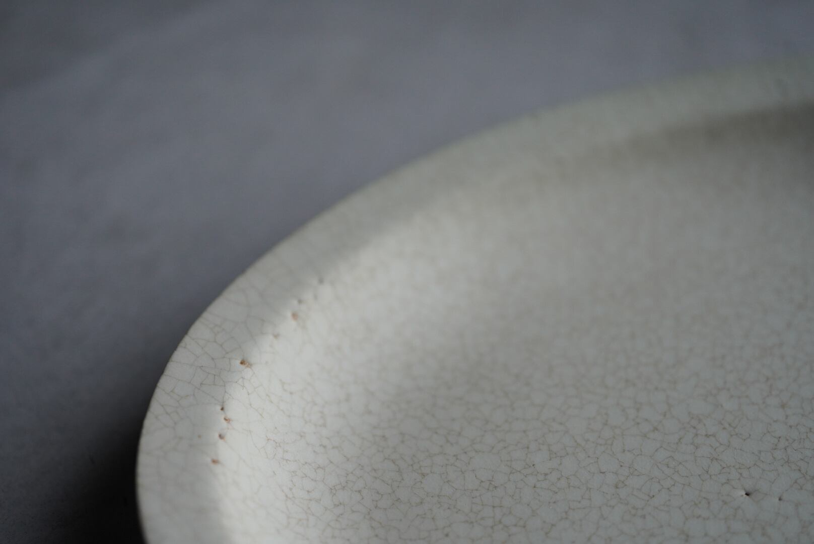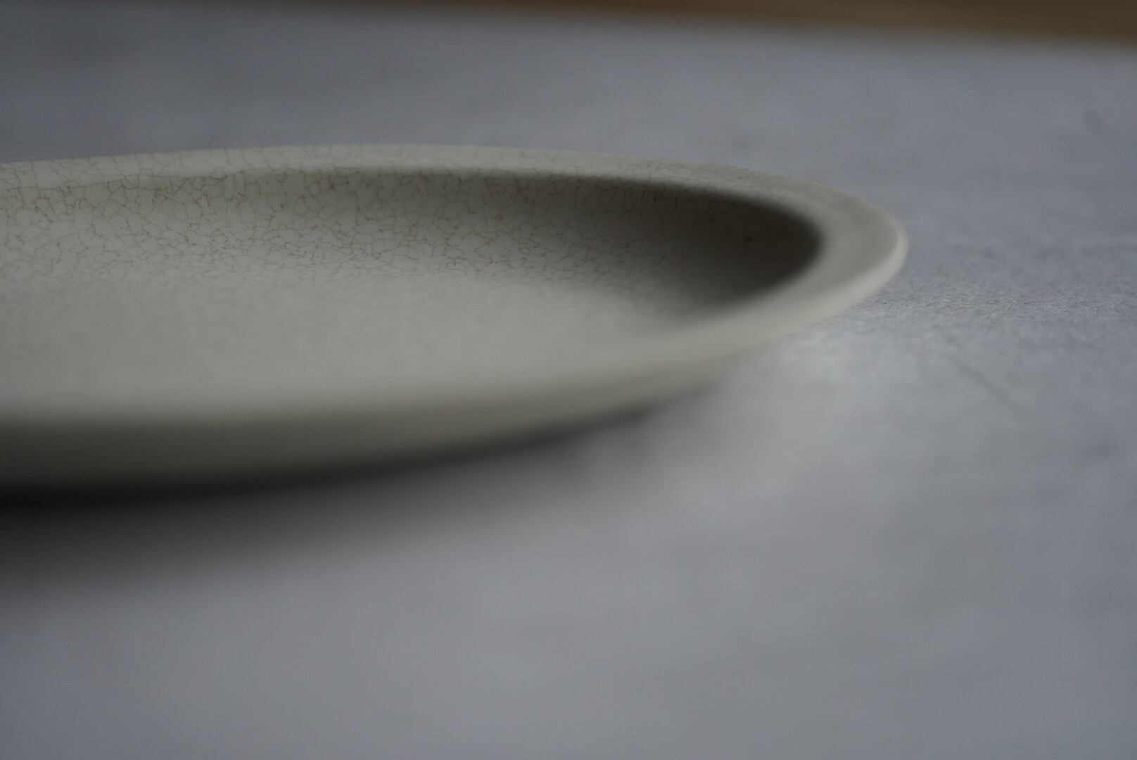 料理が盛られた時に器が完成する。器はあくまで背景。そうお話しされた通り、簡素で美しい輪郭に、何か絹の様なしっとりとした質感の釉薬で仕上げられています。手にしてみると、そのキメ細やかな質感に品質の高さが伺えます。