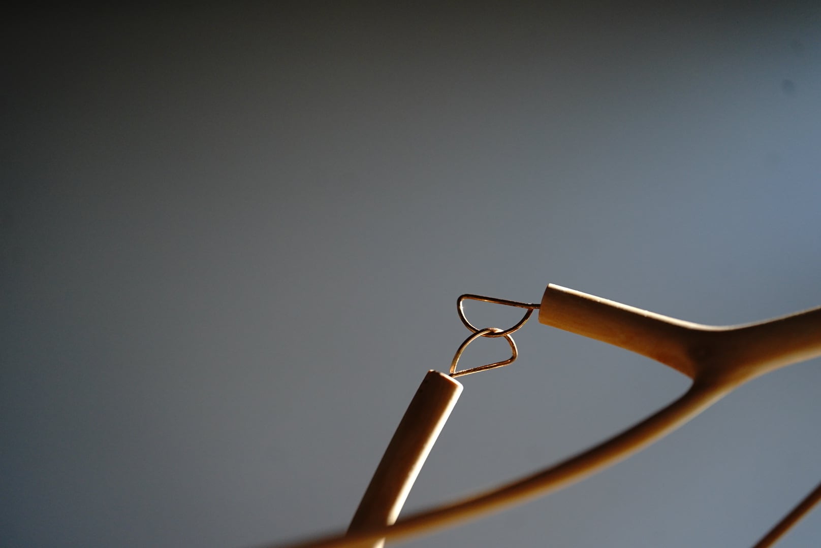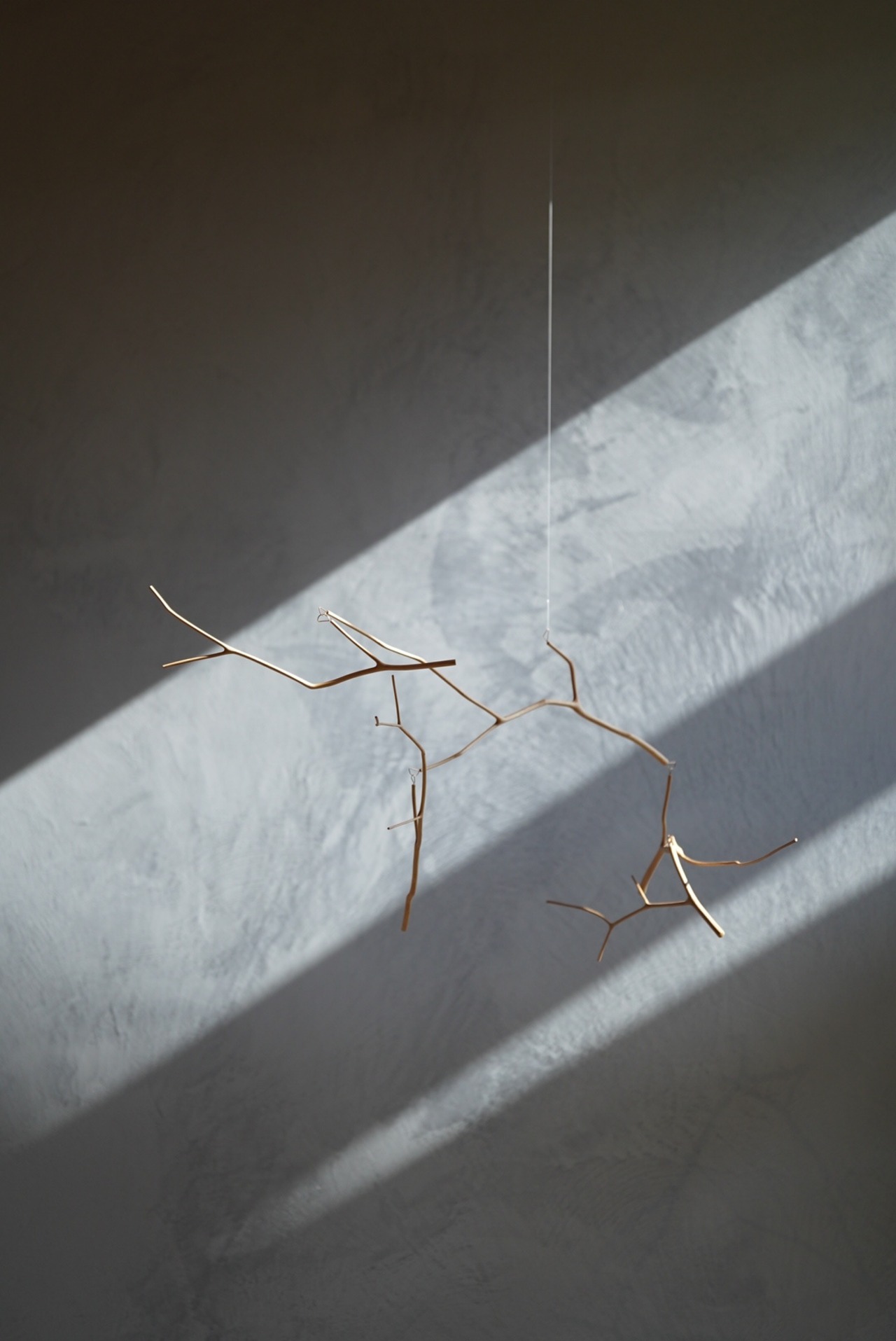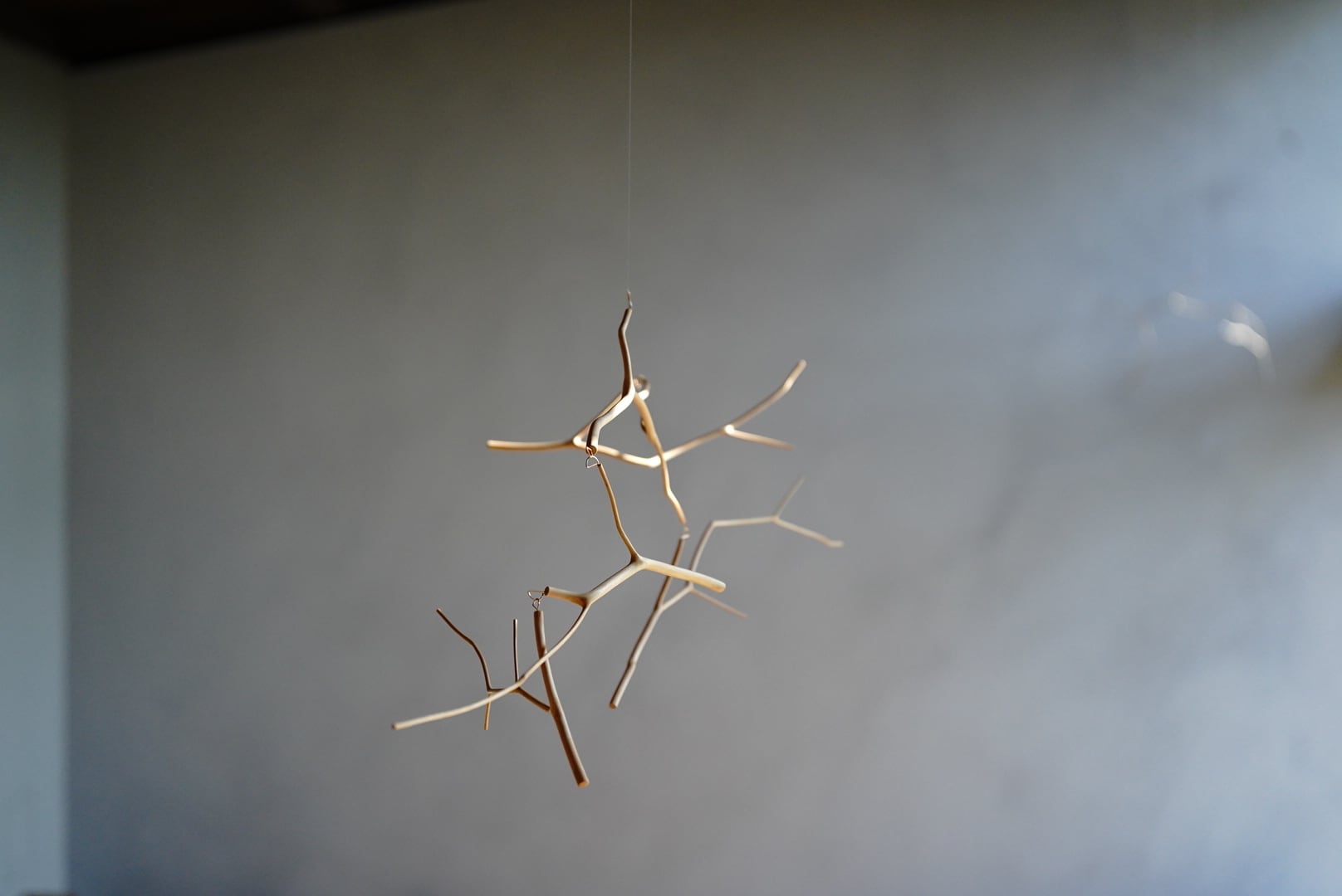 作者と枝の偶然に出会いから、カタチや重量、材料の持つ空間の量感を読み取って刹那的に造形された軽やかに浮遊する彫刻。