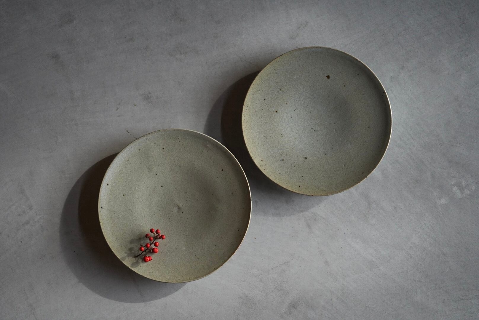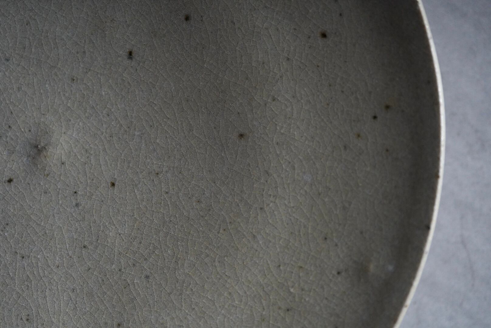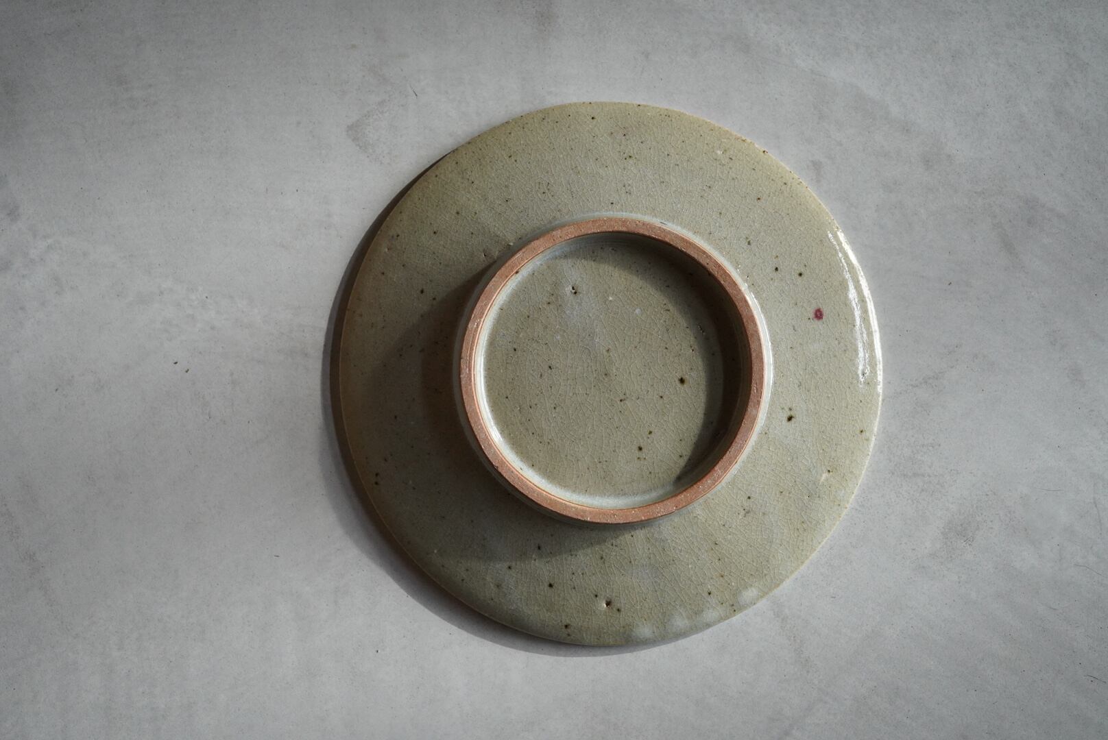 淡い灰緑色で、微細な貫入が見られる高台付きの皿。料理の渋い背景として使い良く、おにぎりやパスタ、旬の野菜やお浸し、デザートプレートとしても使えます。