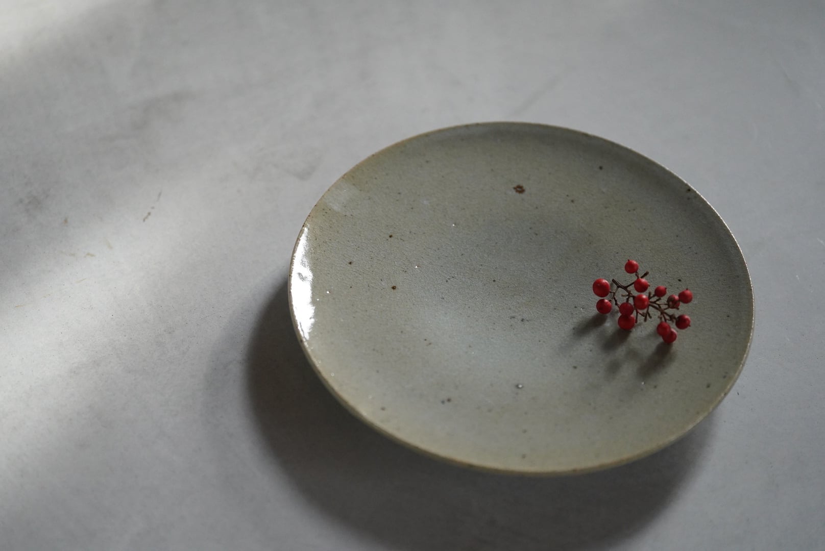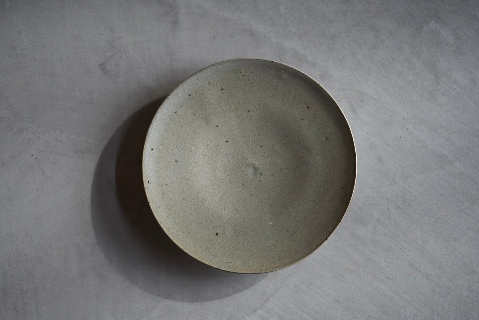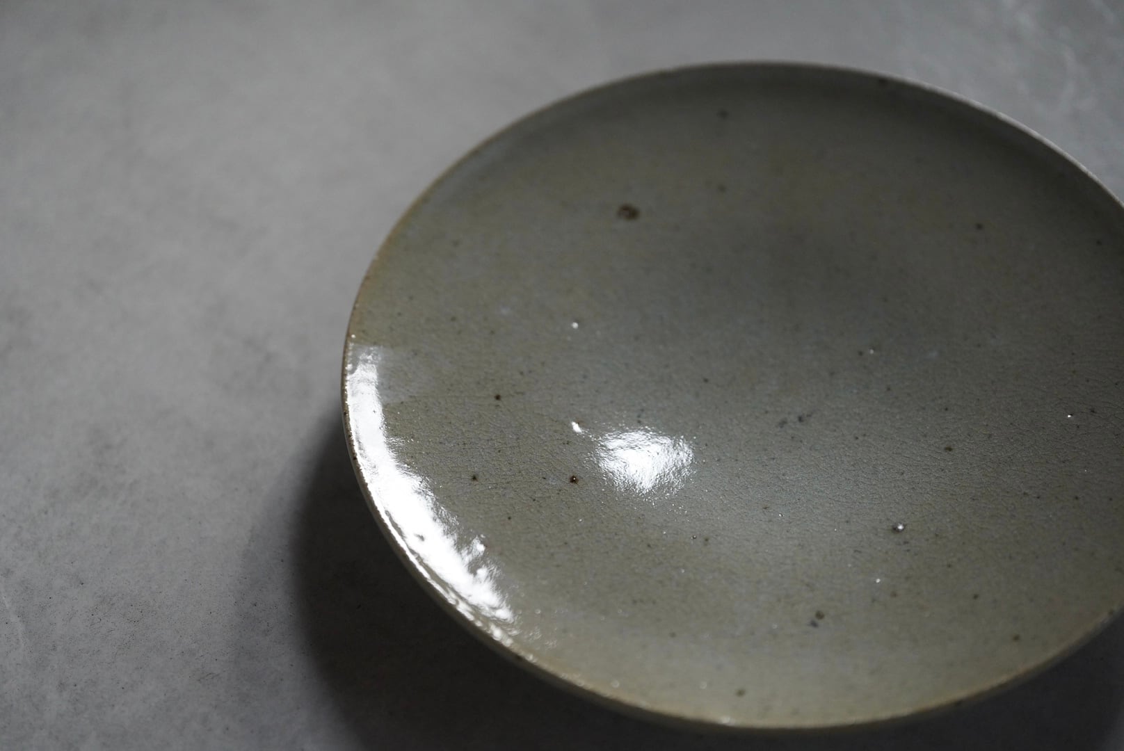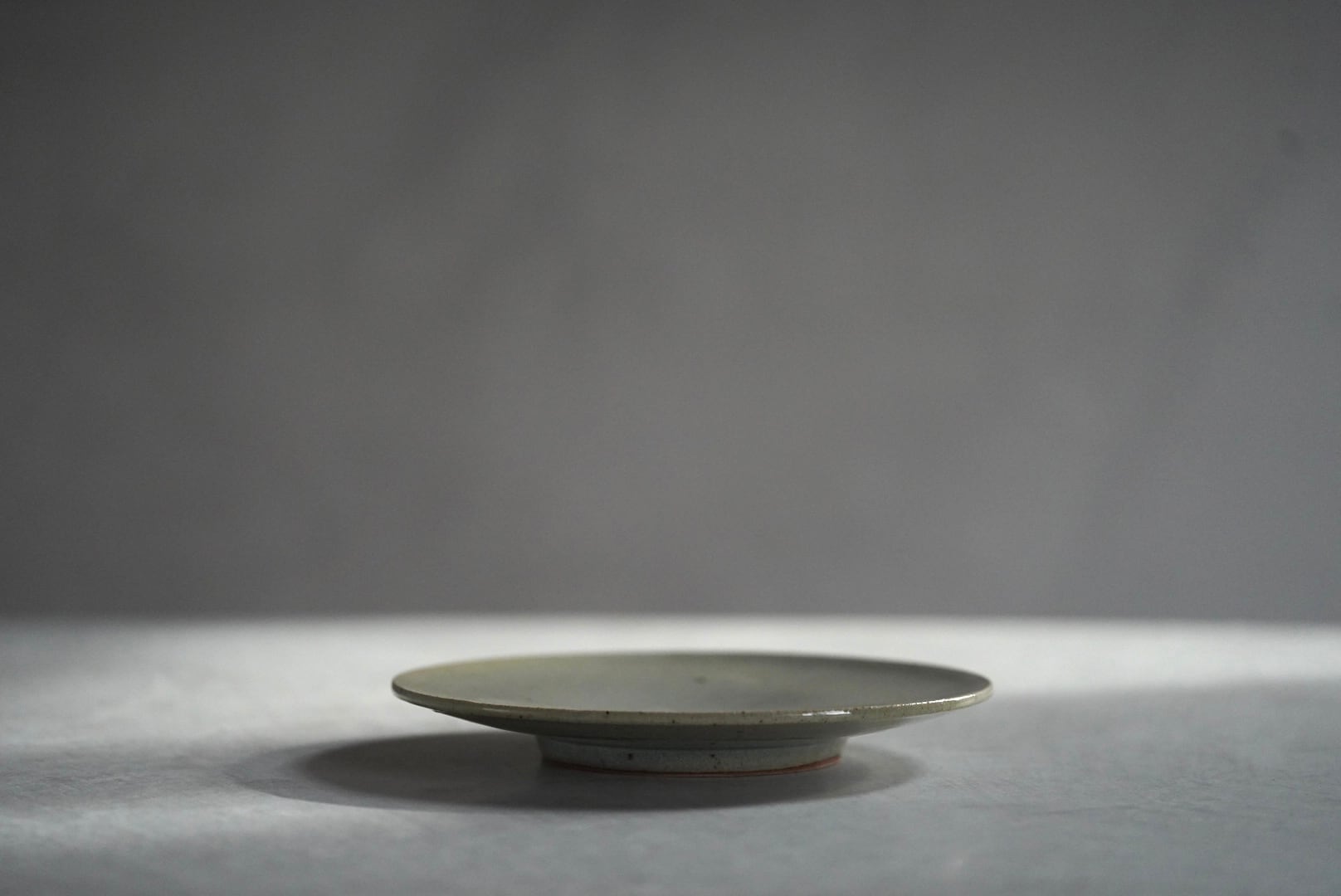 淡い灰緑色で、微細な貫入が見られる高台付きの皿。料理の渋い背景として使い良く、おにぎりやパスタ、旬の野菜やお浸し、デザートプレートとしても使えます。
